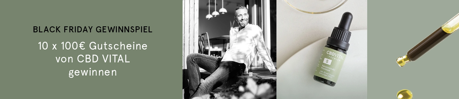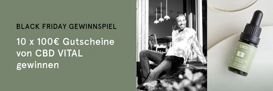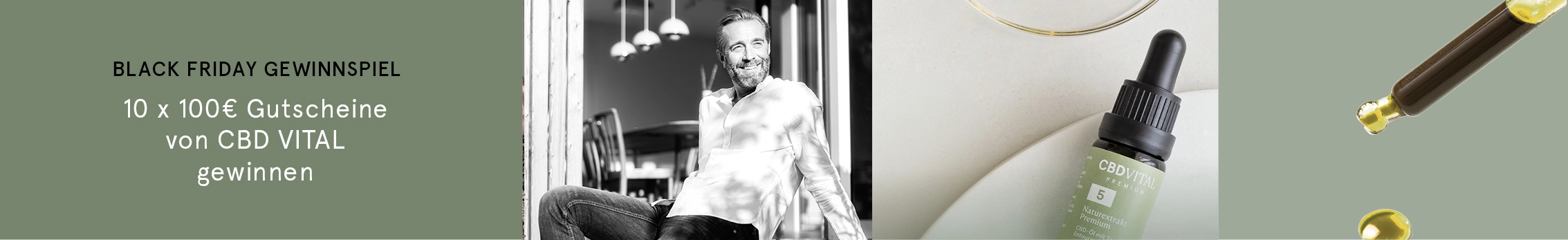 Noch pünktlich vor dem Black Friday verlosen wir 10 × 100 € CBD VITAL Gutscheine! Nutzen Sie die Chance, sich Ihr persönliches Wohlfühl-Upgrade zu sichern mit unseren hochwertigen CBD-Produkten. Ob für mehr Ruhe im Alltag, Regeneration nach dem Sport oder einfach als kleines Stück Entspannung – ein Gutschein von CBD VITAL ist immer ein Gewinn.